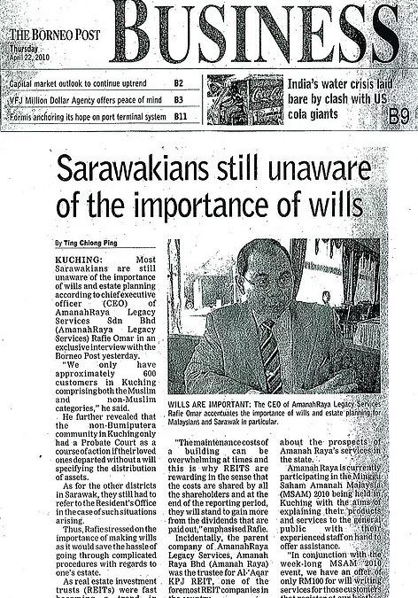 According to CEO of Amanah Raya Legacy Services Sdn Bhd, Rafie Omar, he is concerned that most Sarawakians are still unaware of the importance of wills and estate planning. He mentioned that in 2010, they have only approximately 600 customers in Kuching comprising both Muslim and non-Muslim categories.